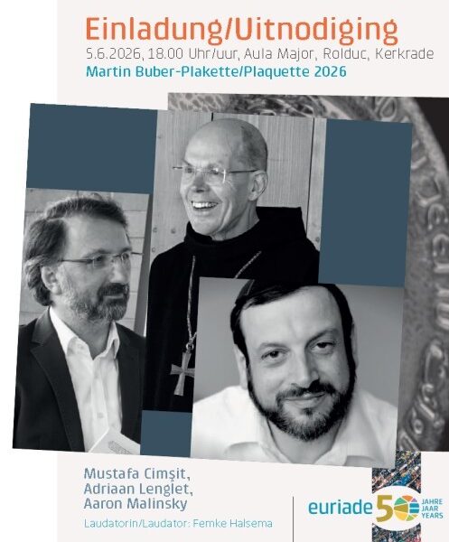 The Chairman of the Stichting Euriade and the Board of Trustees of the Martin Buber Plaque, Werner Janssen, the Mayor of Kerkrade, Petra Dassen, and the Mayor of Herzogenrath, Benjamin Fadavian, have the honor of inviting you to the awarding of the Martin Buber Plaque.